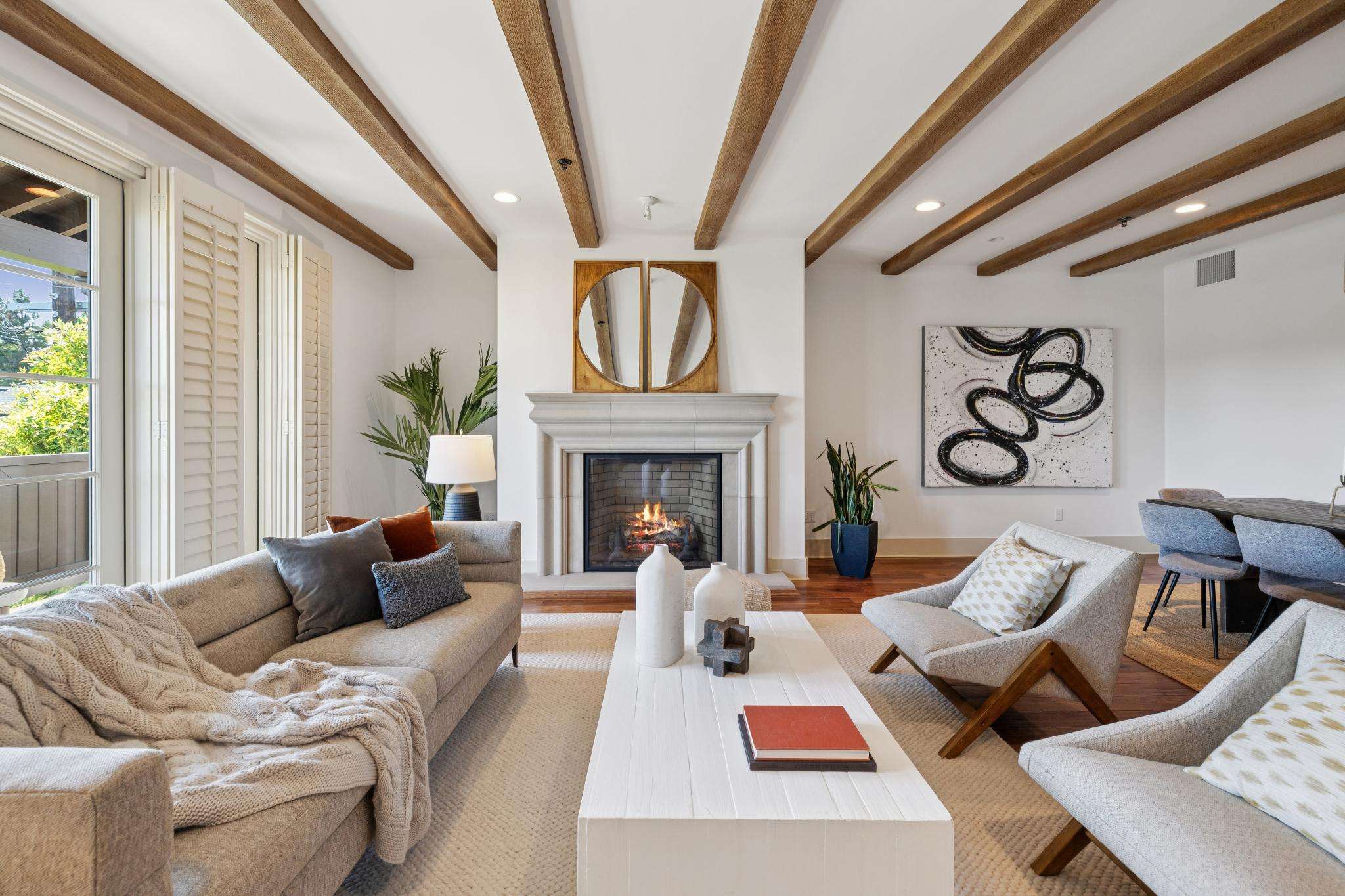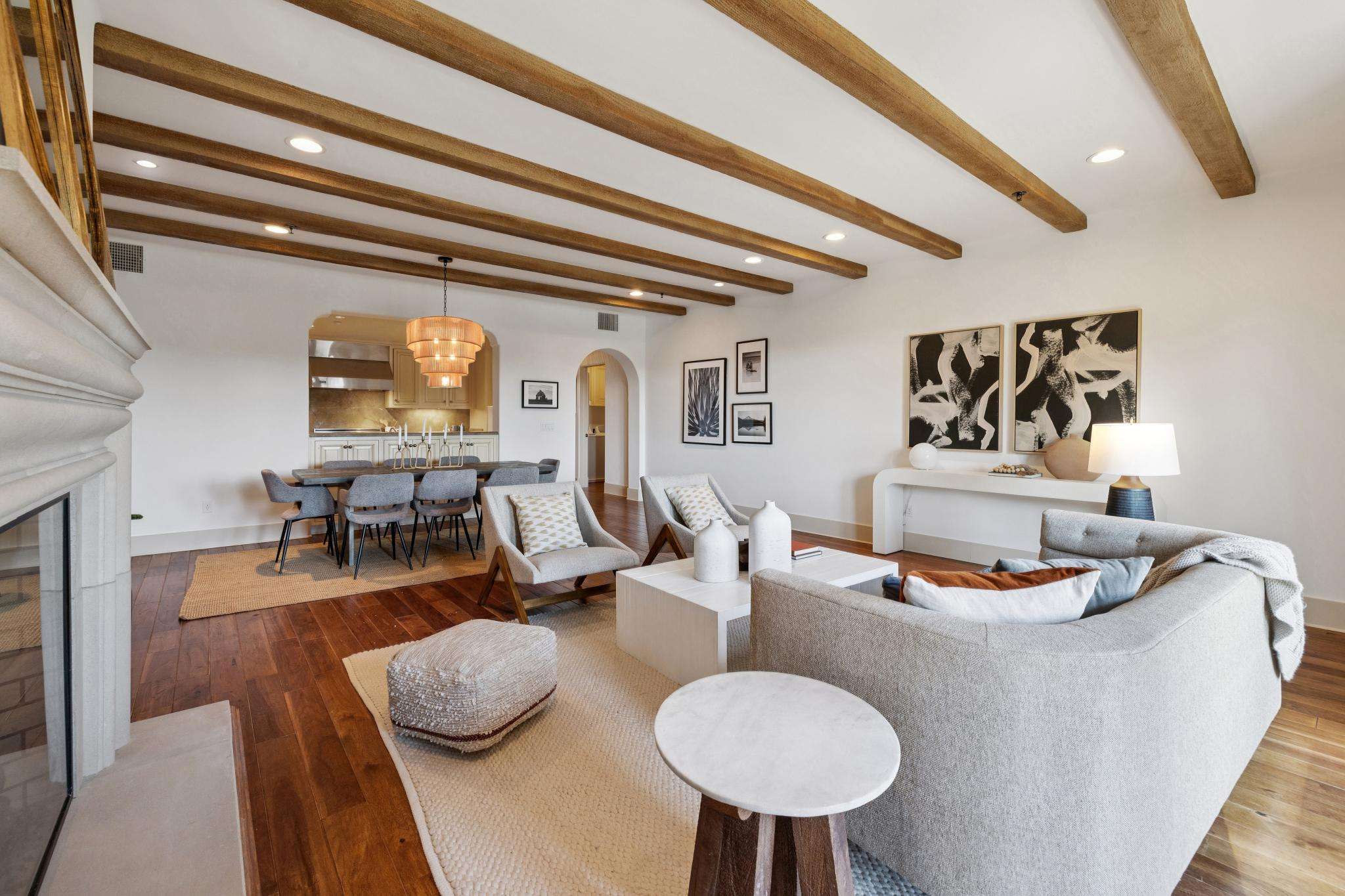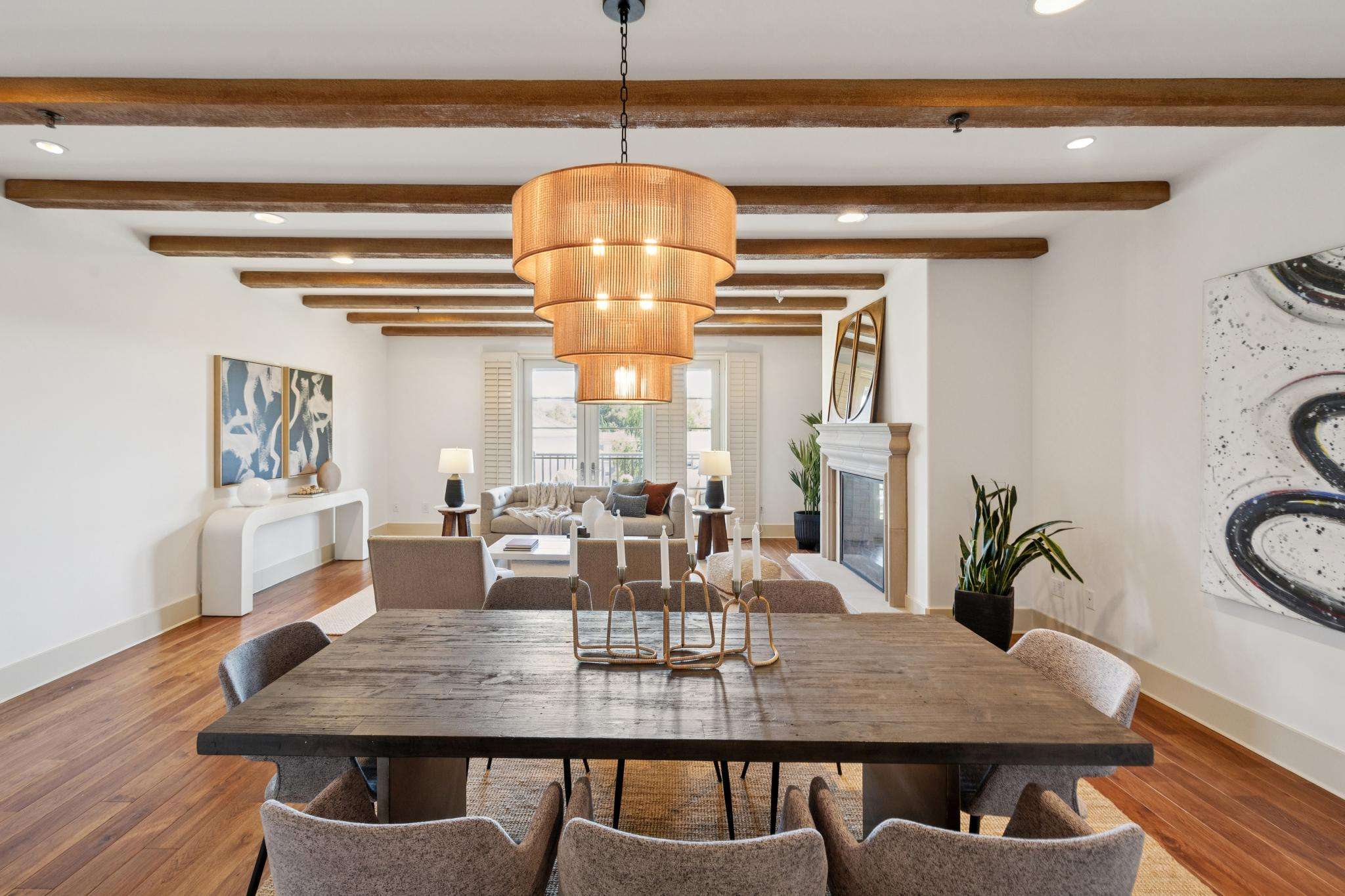This thoughtfully designed, top-floor 2-bedroom, 2-bath condo with office features an open floor plan with a seamless flow between the living, dining, and kitchen spaces. The living room is accented by striking wood beam ceilings, while the dining area opens directly to the kitchen, creating the ideal layout for entertaining. The chef’s kitchen boasts luxury appliances, sleek finishes, and abundant storage.